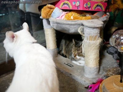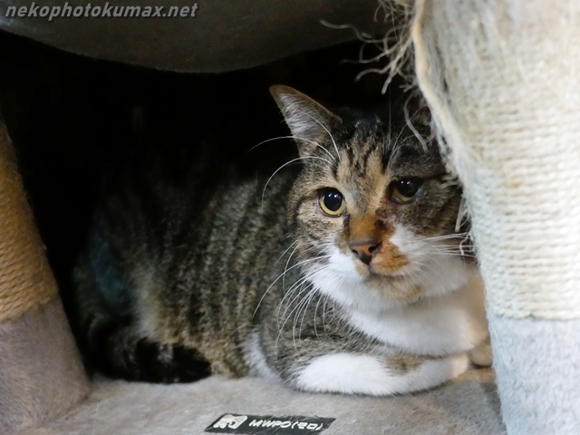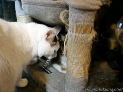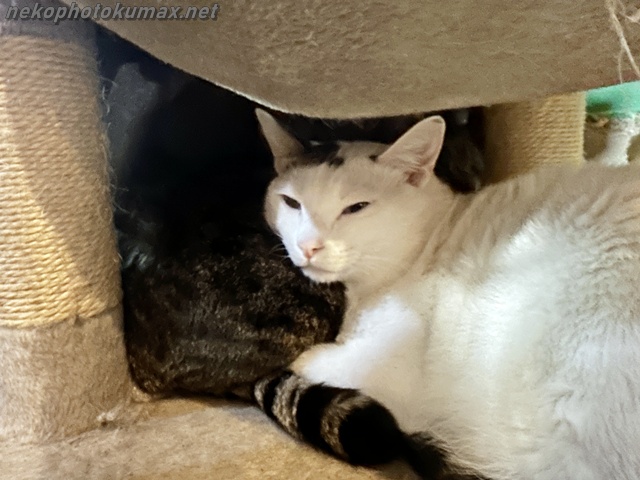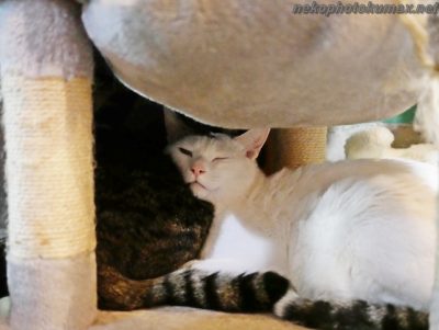 ご挨拶の後はキャットタワーの下に一緒に潜り込んで眠るムサシくんとマメくん。