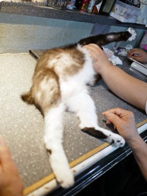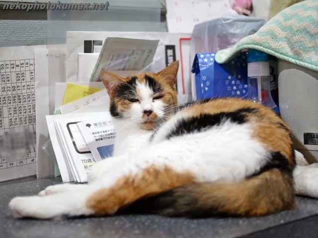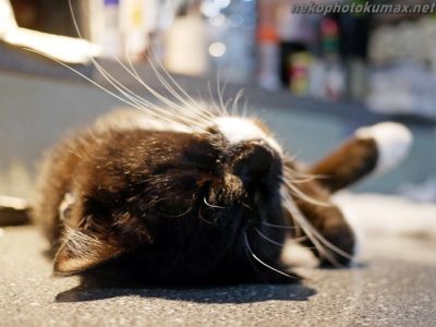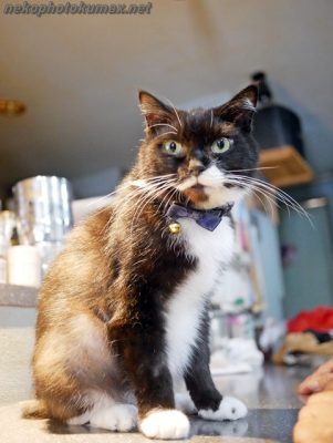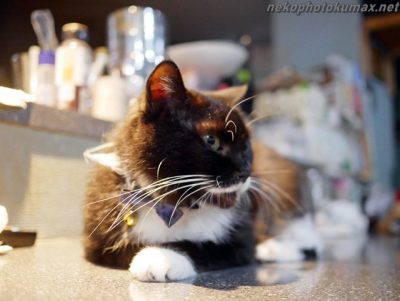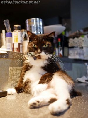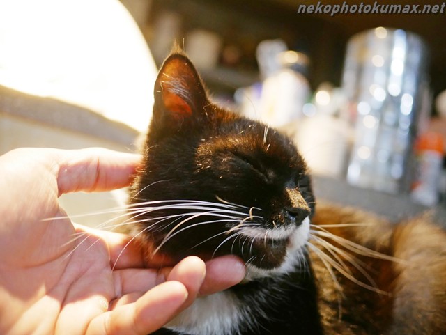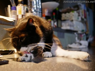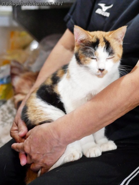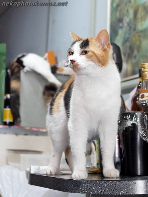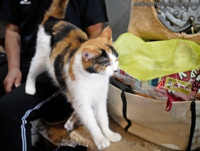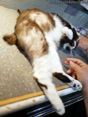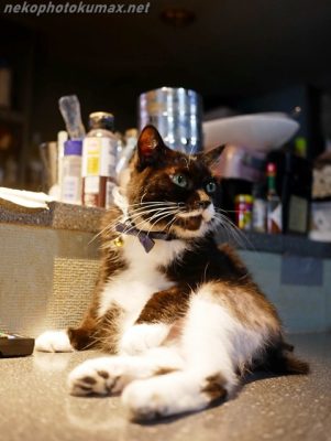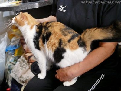 キャットタワーで毛づくろいするアンコさんにご挨拶。
