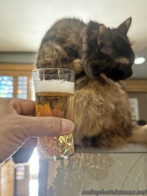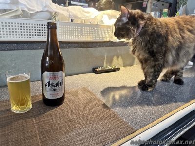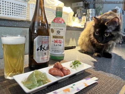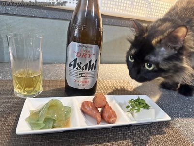 暑い夏にビールと枝豆!横には猫さん!