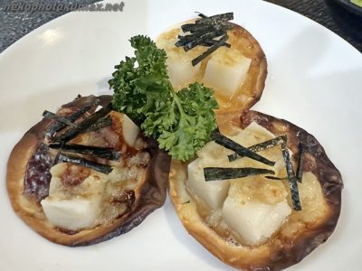 餃子の皮に持ちチーズをのせて焼いたもの。