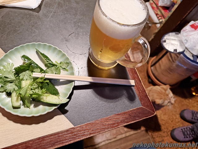 2杯目の生ビールとパクチーキュウリをいただきながら…