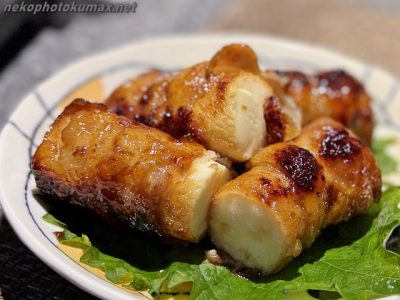 ハムチーズを餃子の皮で包んで焼いたもの。