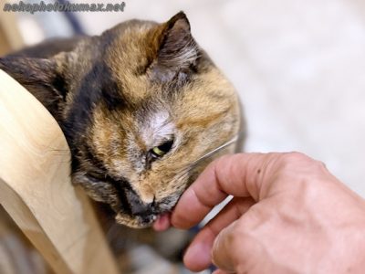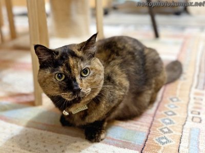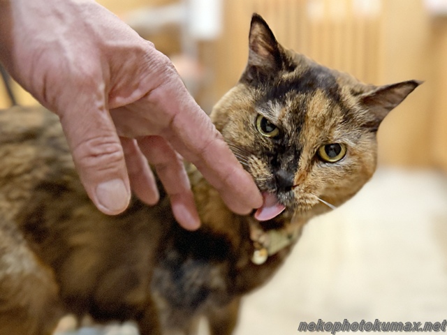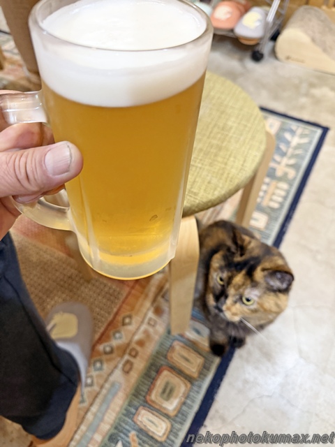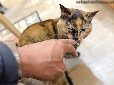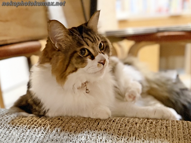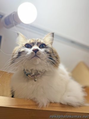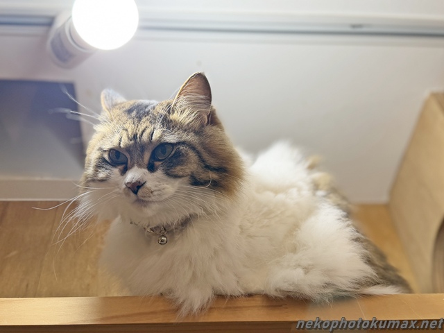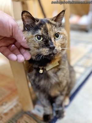 なつめさん、猫店員専用デスクに移動して写真のさつきさんに聞いているようです。