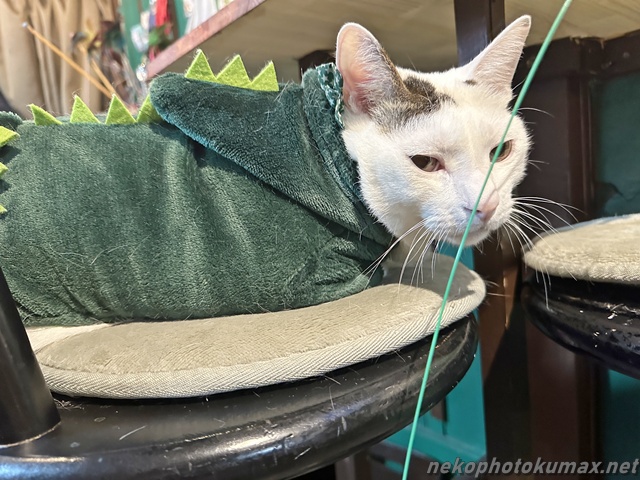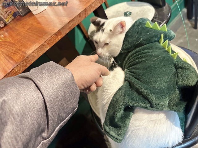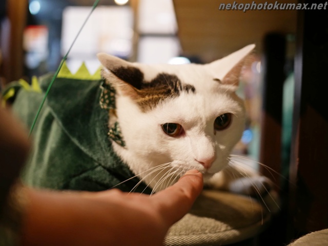 恐竜コスのムサシくんに指を出してご挨拶。