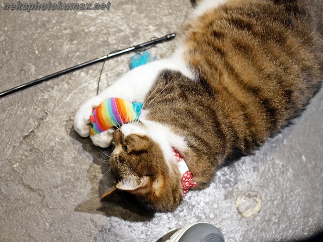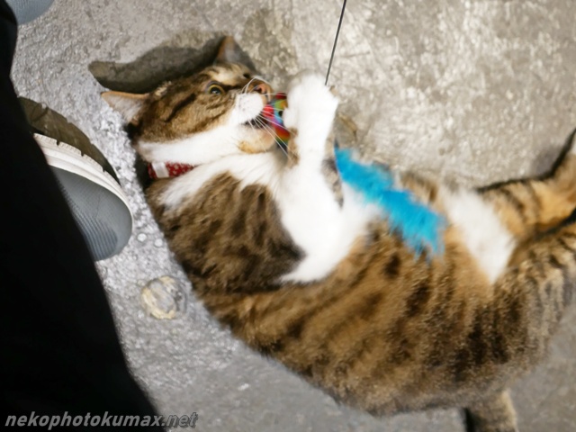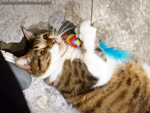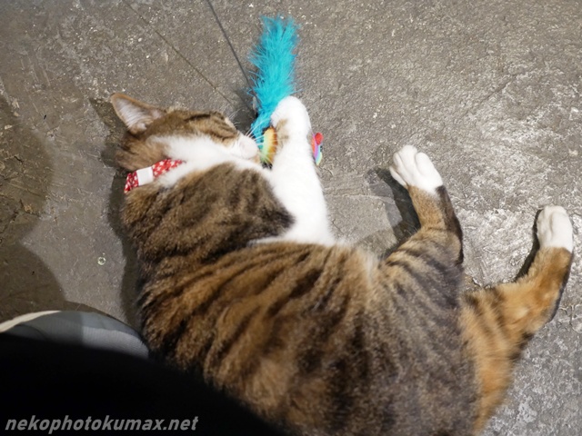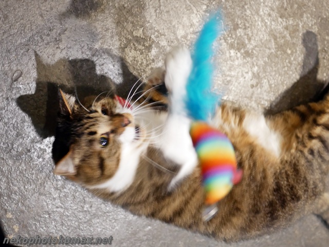 寝転がったままネコジャラシをガシガシ!