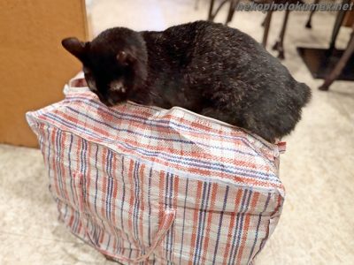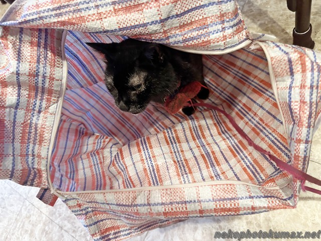 搬入時に写真パネルを持ってきたバッグに潜り込み…
