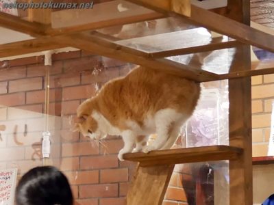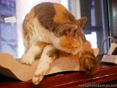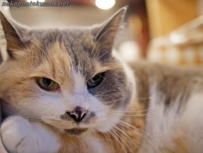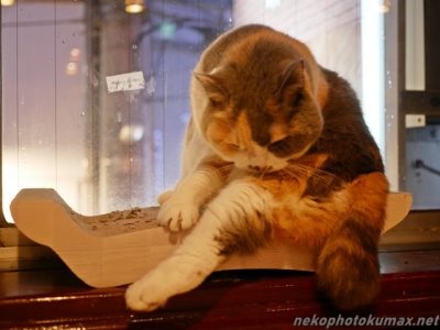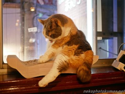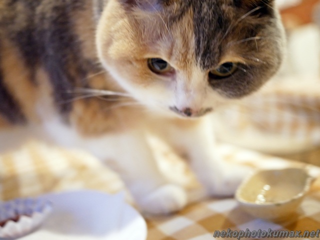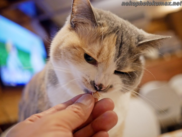 あれ?店主の茶々さんがノンちゃんを肉球ロードから降ろそうと新しいおやつを出していますね。
