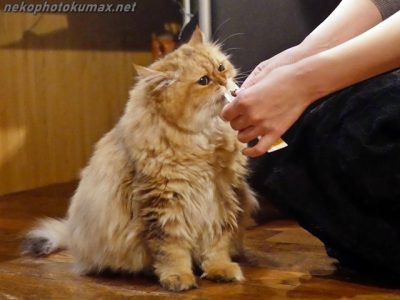 常連さんの手を抑えて液状おやつを舐めるチーちゃん。
