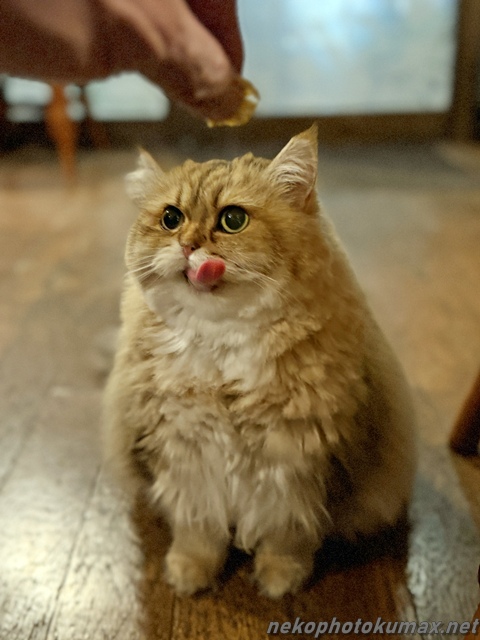 ペロッと舌を出しておやつを見つめるチーちゃん。