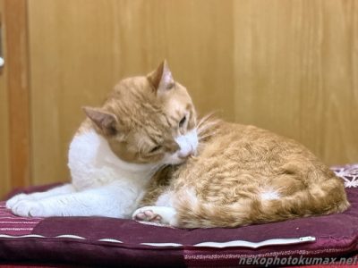 イチくんは小上がりの座布団に乗って毛づくろい。