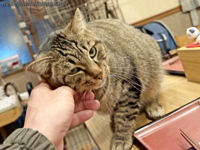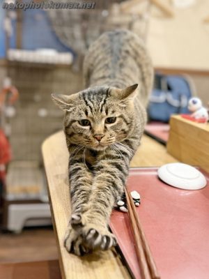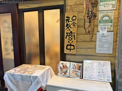 店頭には今日のおすすめメニューと猫さんの写真が出ています。