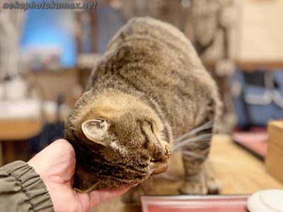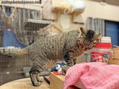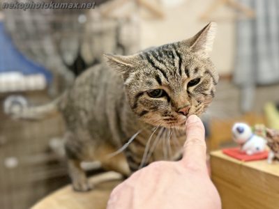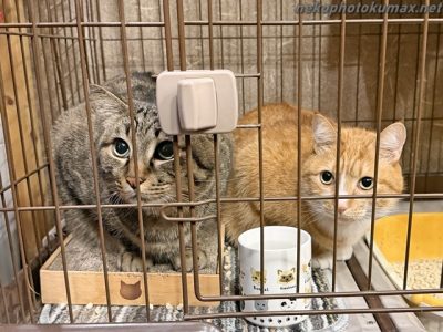 入口際のケージにキジトラのソラくんと茶白のモカくん。